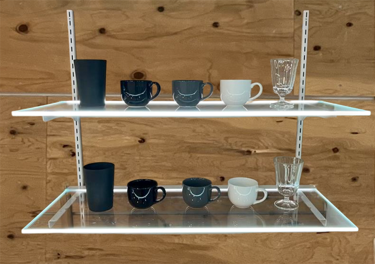 - 特性:独自の光学設計技術により、柔らかな面の光で商品を均一に照らすため影を抑えることや、ガラス同等の高い透明性が特徴です。消灯時は一枚の透明なガラスのように空間に溶け込み、点灯時は棚板自体が上質な照明となって商品をドラマチックに照らし出します。